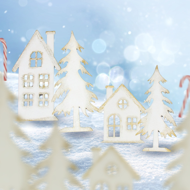 Natúr fa - Házikó szett 2db/cs fehér-arany – karácsonyi dekorációhoz