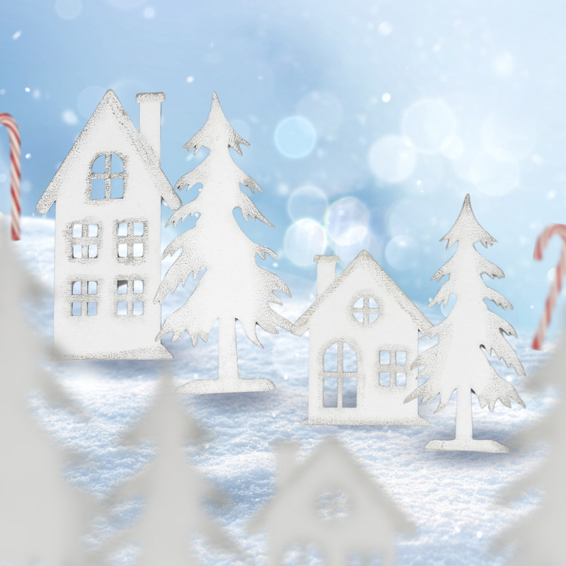 Natúr fa - Házikó szett 2db/cs fehér-ezüst – karácsonyi dekorációhoz