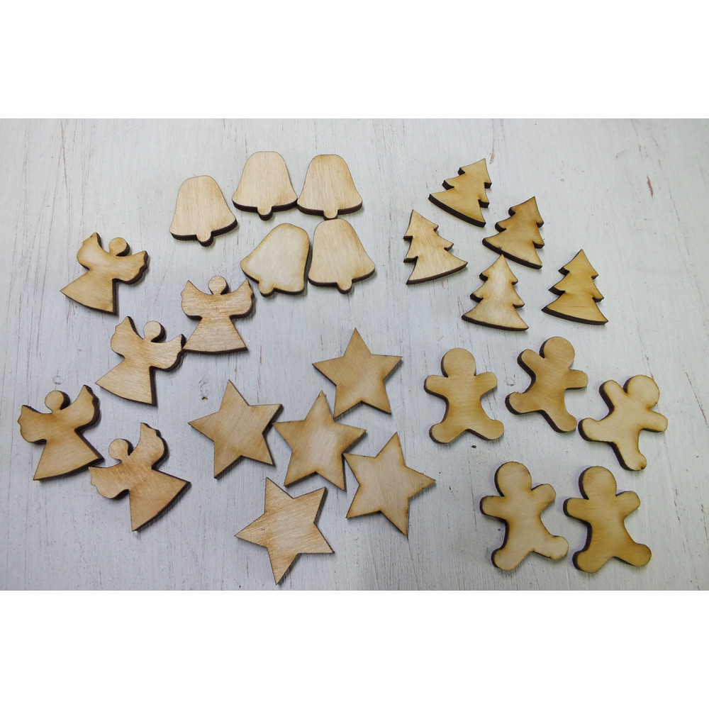 Az ár 25db fa figurát tartalmaz: 5db angyal, 5db fenyő, 5db csillag, 5db mézi, 5db harang.Karácsonyi vegyes figurák - karácsonyi trend kedvenc motívumait gyűjtöttük össze. Méret: 2,5-3cm, vastagság:3mm ​Karácsonyi figurák, karácsonyi kellékek és kiegészítők. Felhasználható karácsonyi asztaldíszhez, koszorúhoz és ünnepi dekorációhoz.
