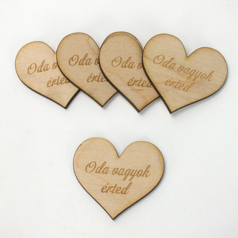 Natúr fa - " Oda vagyok érted" gravírozott szív 4x4,5cm 5db/csomag – valentin napi ajándékhoz és romantikus dekorációhoz