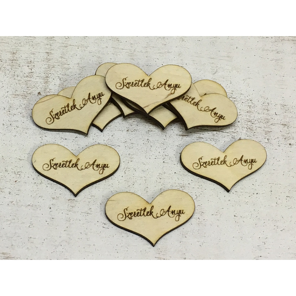 Natúr fa - "Szeretlek Anyu" gravírozott szív 10db/csomag – anyák napi ajándékhoz és dekorációhoz