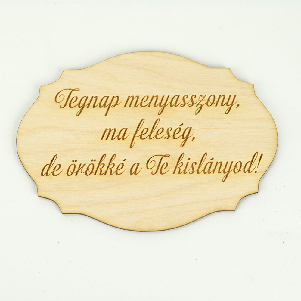 Esküvői feliratos tábla, szülőköszöntő ajándékokhoz.Saját gyártású fa termékeink számos lehetőséget kínálnak. Festheted, dekupázsolhatod, ragaszthatod, díszítheted csipkével, verettel, szalaggal, de natúr állapotban is tökéletes dekoráció. Méret: 13,5x9,5cm, vastagság:3mm