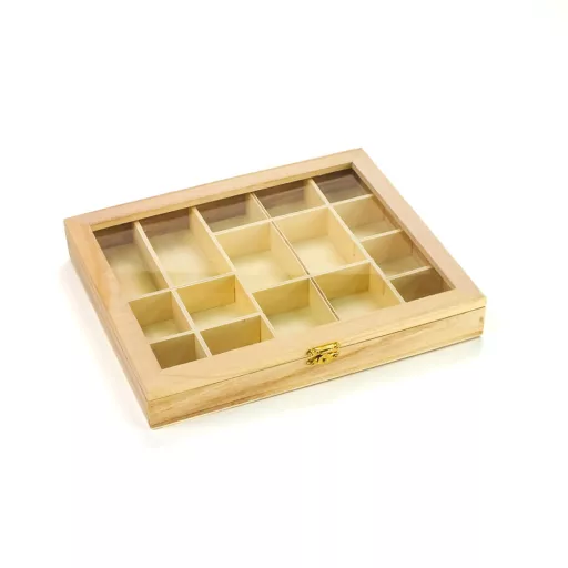 Natúr fából készült, átlátszó tetejű tároló, 16 rekesszel. Ékszeres dobozként, gyöngyök tárolására, vagy egyéb kis méretű kellékek organizálásához. Méret: 28x23cm, mag: 4cm. Felhasználható festéshez, decoupage technikához és egyedi dekorációhoz.
