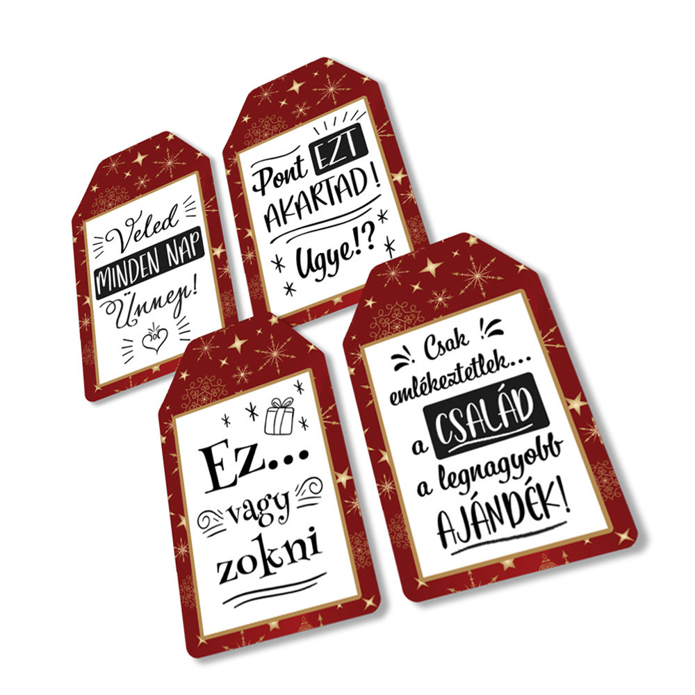 Nyomtatott dekorkarton - Ajándék kísérő táblák humoros 4db/csomag – karácsonyi koszorúhoz és asztaldíszhez