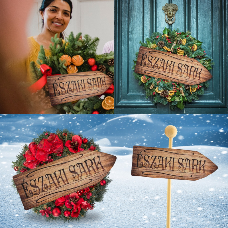 Nyomtatott dekorkarton - Északi sark útjelző 26cm – karácsonyi koszorúhoz és asztaldíszhez