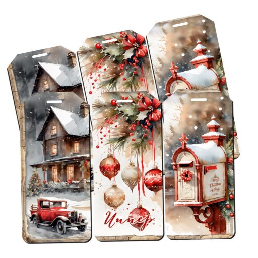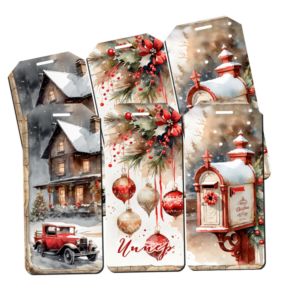 Nyomtatott dekorkarton - Karácsonyi piros téma - biléták 6db/csomag – karácsonyi koszorúhoz és asztaldíszhez