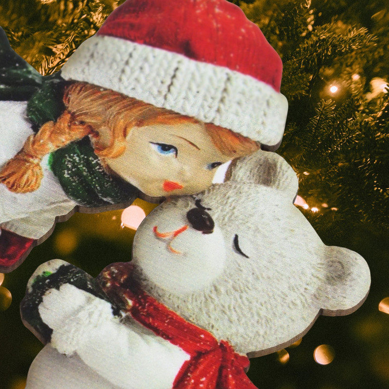 Nyomtatott dekorkarton - Kislány macival 10x13cm – karácsonyi koszorúhoz és asztaldíszhez