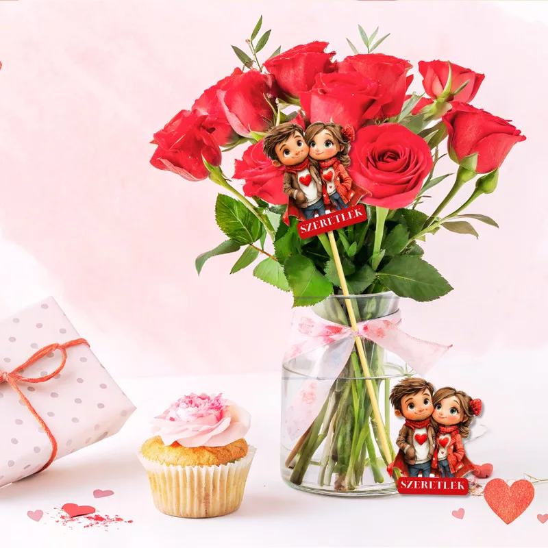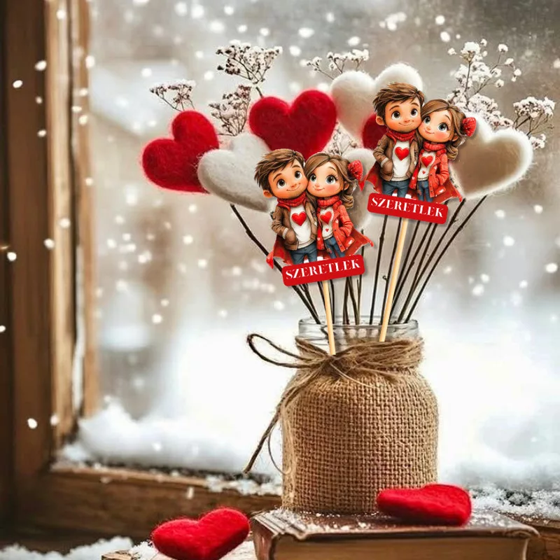 Ez a nyomtatott dekorkarton csomag két darab szerelmes párt ábrázoló dekorációt tartalmaz, „Szeretlek” felirattal kiegészítve. Saját gyártású termék, amely ideális választás Valentin-napi, esküvői, eljegyzési vagy évfordulós dekorációkhoz, de bármikor romantikus hangulatot varázsolhat otthonodba. Könnyű anyaga miatt egyszerűen rögzíthető, és jól kombinálható más romantikus dekorációs elemekkel. Méret:7x5cm