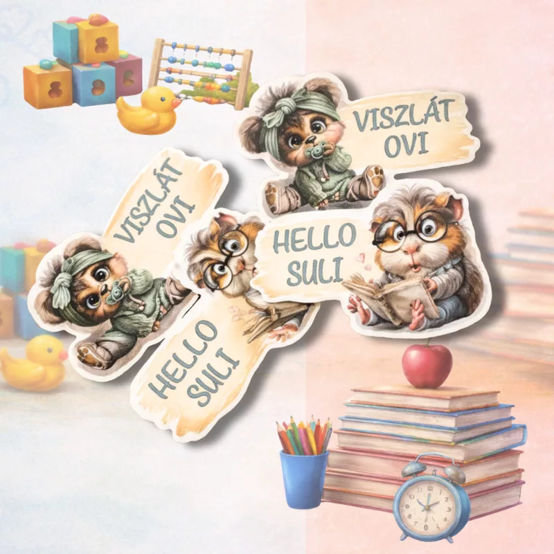 Ez a saját gyártású nyomtatott dekorkarton a „Viszlát ovi" "Hello suli” felirattal tökéletes választás óvodai ballagásra és iskolakezdési alkalmakra. Szépen illeszkedik koszorúkhoz, ajtódíszekhez és faldekorációkhoz, de virágcsokorba tűzve vagy ajándék mellé kiegészítő dekorációként is remekül mutat. A gondosan nyomtatott felület esztétikus, egységes megjelenést biztosít, a 2 darabos kiszerelés pedig lehetőséget ad több kompozíció elkészítésére vagy páros díszítés kialakítására az ünnepi alkalomhoz.Méret 8,2x7,4cm