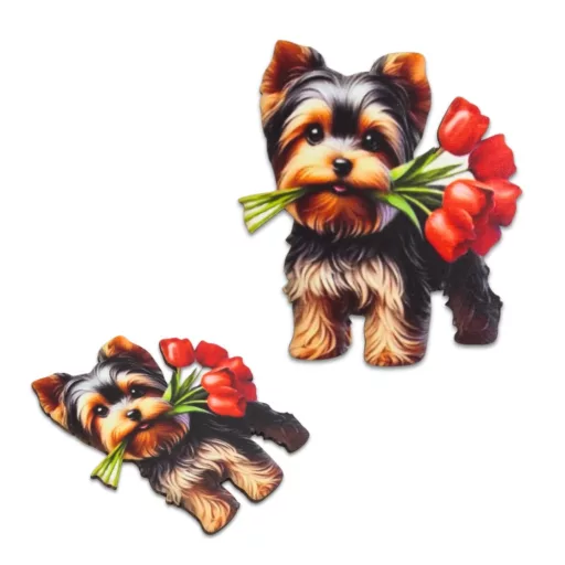 Nyomtatott dekorkarton - Yorkshire kutya virágcsokorral 2db/cs – dekorációhoz és koszorúhoz