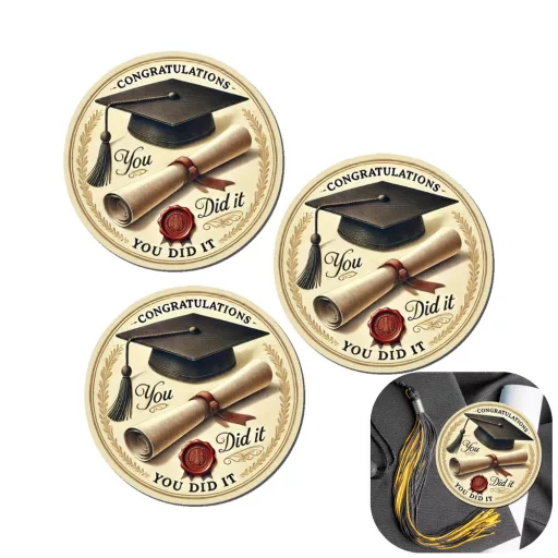 Különleges nyomtatási eljárással készített, lézervágott dekorkarton táblák. Előnyös a kézzel alkotott készítmények kihangsúlyozásához, így megjelenésével kiemeli azt a hétköznapi díszek közül.Méret: átmérő: 5cm, vastagság: 2mm. Felhasználható ballagási ajándékhoz és emlékdekorációhoz.