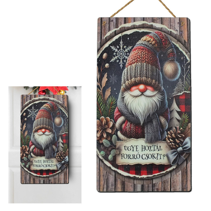Nyomtatott fa tábla - Hoztál forrócsokit? manó 13x24,3cm – karácsonyi koszorúhoz és asztaldíszhez