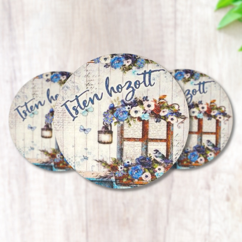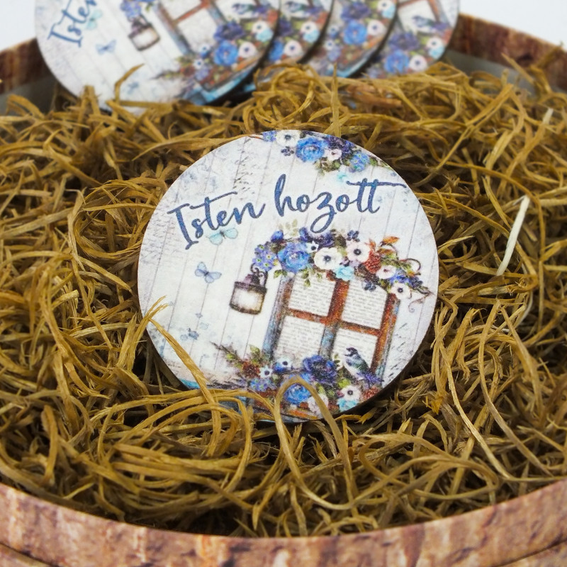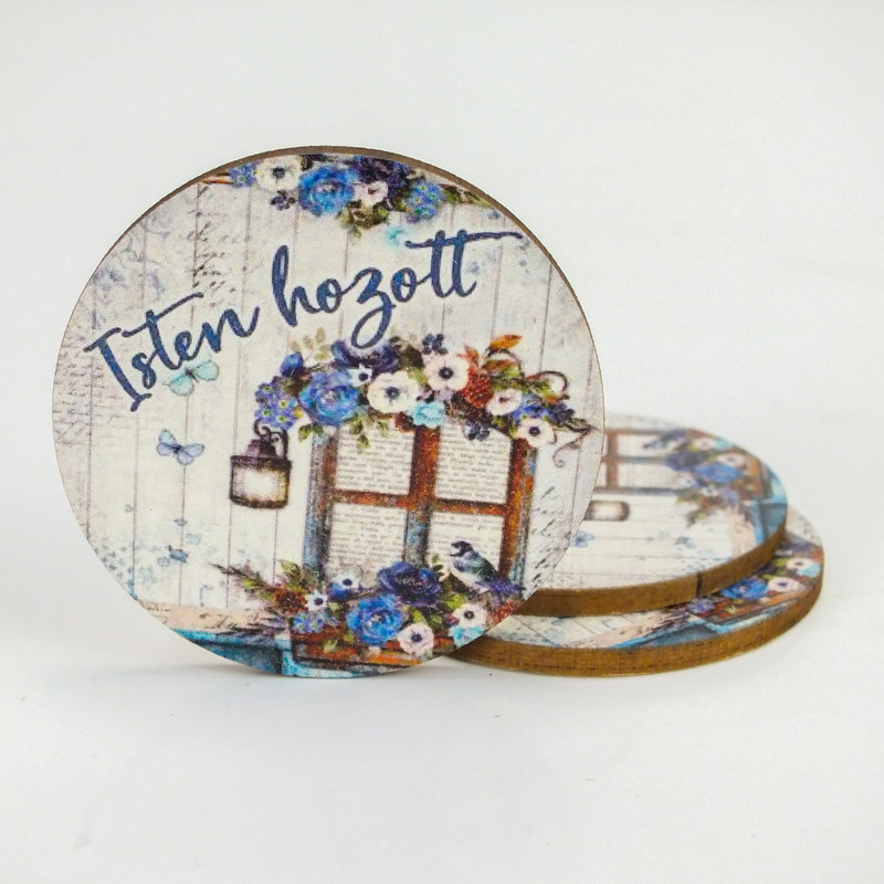 Nyomtatott fa tábla - Isten Hozott - kék, kör 3db/cs – nyári dekorációhoz