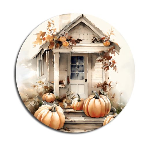 Nyomtatott fa tábla koszorú közép - Fehér-narancs tök házzal 11,8cm – őszi dekorációhoz