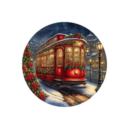 Nyomtatott fa tábla koszorú közép - Karácsonyi villamos 11,8cm – kreatív dekorációhoz