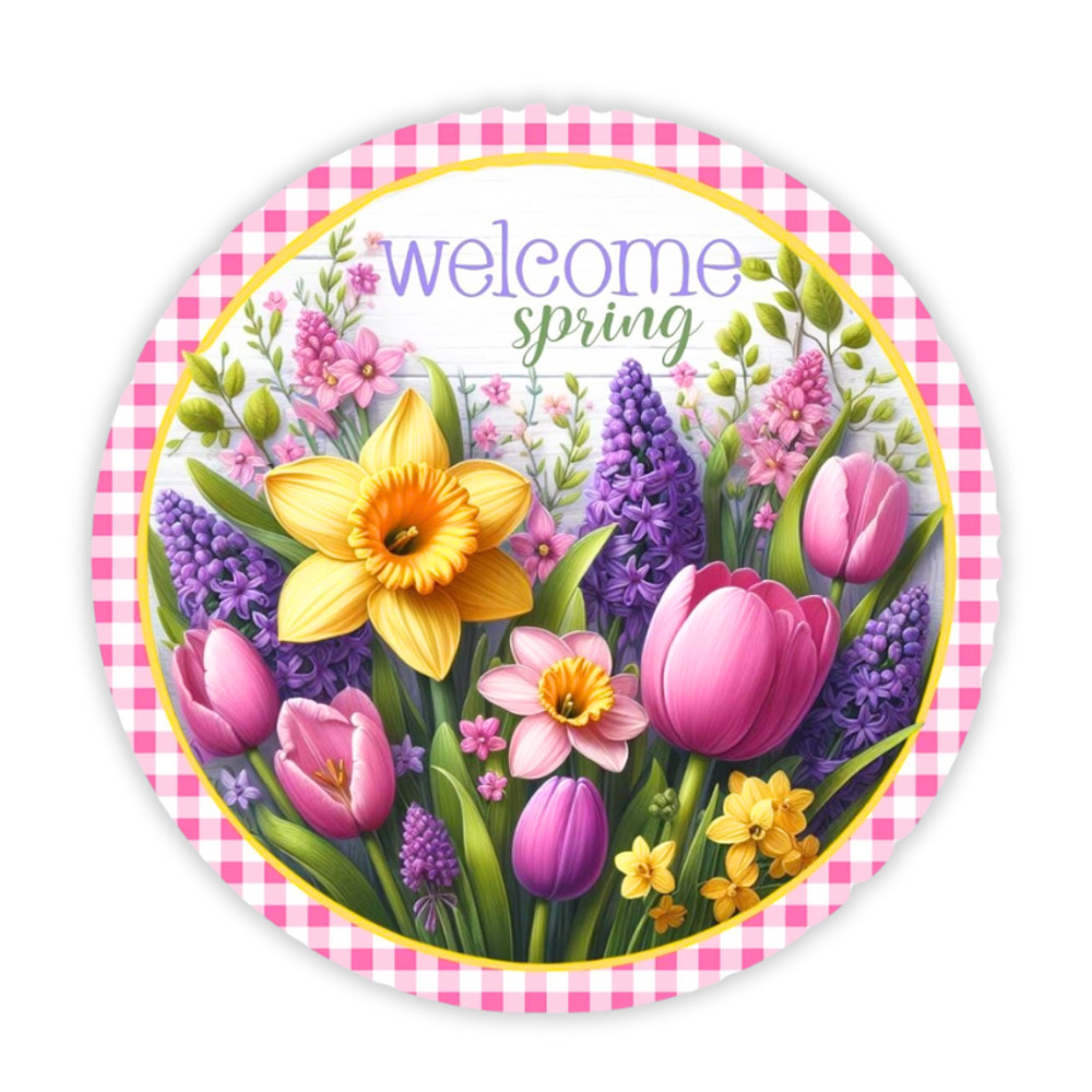 Nyomtatott fa tábla koszorú közép - Welcome Spring 14,8cm – koszorúkészítéshez