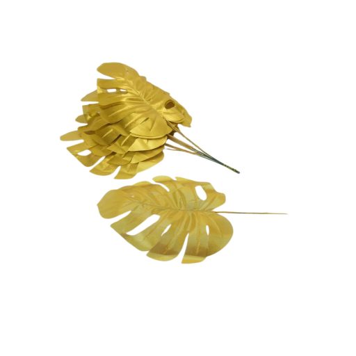 Matt arany philodendron levél otthoni vagy kirakati díszítéshez. Önmagában vagy kiegészítő díszítéshez, készítményekhez egyaránt használható.Méret: hossz: 39cm, szél: 19cm
