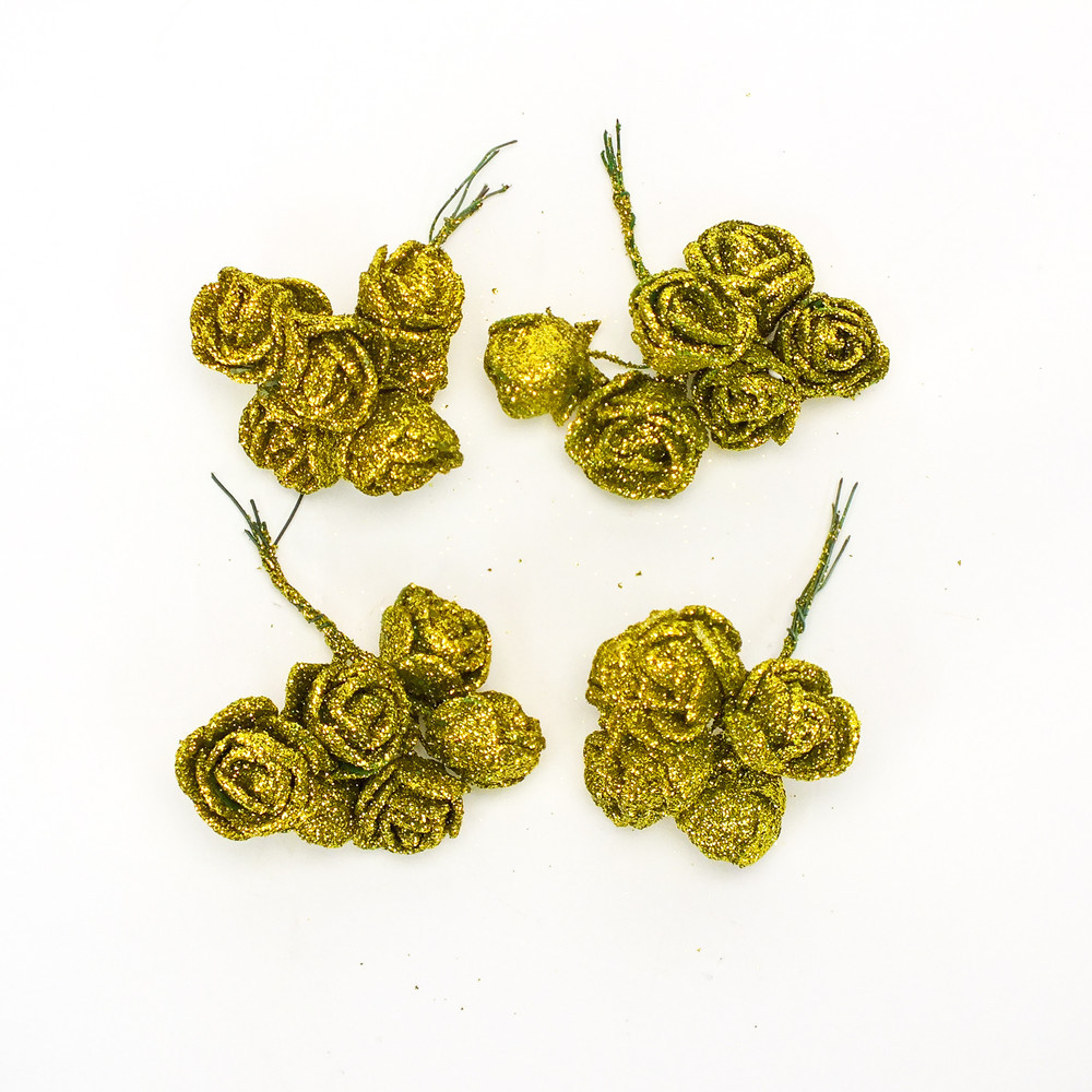 4x6 darabos csillámos rózsafej csokor. Tökéletes díszítő karácsonyi dekorációkhoz, egyedi készítményekhez és kreatív alkotásokhoz. Vékony fém szára lehetővé teszi a könnyű felhasználást.Teljes méret: 8cm, virágfej méret: 2cm
