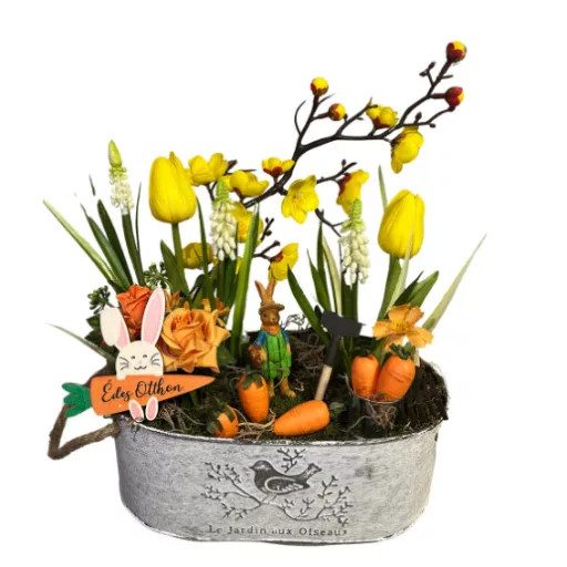 Üdvözöld a tavaszt ezzel a bájos Répás Asztaldísszel, amely tökéletesen harmonizál a Répás Koszorúval, de önállóan is gyönyörű dekorációként szolgál! A "Csináld Magad" csomag minden szükséges alapanyagot tartalmaz, hogy saját kezűleg alkothasd meg ezt a vidám és színes asztaldíszt. A sárga tulipánok, a narancssárga répák és a kedves nyuszi figurák egyedi és játékos hangulatot varázsolnak otthonodba. Legyen szó étkezőasztalról, polcról vagy ajándékról, ez az asztaldísz minden környezetben tavaszi frissességet és örömet sugároz.