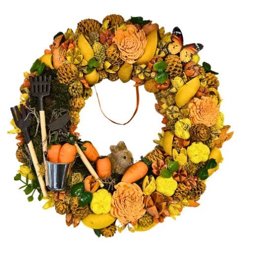 Hozz vidámságot és természetes frissességet otthonodba ezzel a különleges Répás Koszorúval! A "Csináld Magad" csomag segítségével három méretben is elkészítheted ezt az élénk, narancssárga árnyalatokkal és vidám tavaszi elemekkel díszített koszorút. A répák, kerti szerszámok és a bájos nyuszifigura egyedi, játékos hangulatot adnak, amely garantáltan mosolyt csal mindenki arcára. Akár ajtódra, akár faladra helyezed, ez a koszorú tökéletes választás a tavasz és a természet üdvözlésére. Az alkotási folyamat egyszerű és örömteli, miközben egyedi, saját készítésű dekorációval gazdagítod otthonodat!