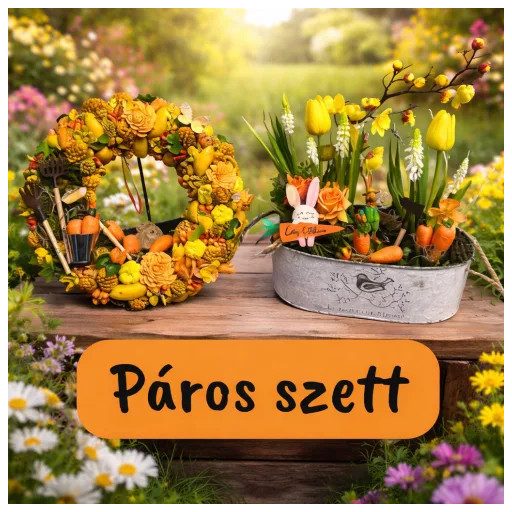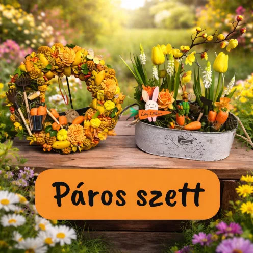 Tedd otthonodat a tavasz legvidámabb színtereivé ezzel a különleges Répás Páros Szettel, amely tartalmazza a Répás Koszorút és az ahhoz tökéletesen illő Répás Asztaldíszt! A "Csináld Magad" csomag segítségével saját kezűleg alkothatod meg ezeket a vidám és természet ihlette dekorációkat, miközben átélheted az alkotás örömét. A koszorú három méretben érhető el (20 cm, 25 cm és 30 cm), így könnyedén az otthonodhoz igazíthatod. Az asztaldísz pedig a sárga tulipánokkal, répákkal és kedves nyuszi figurákkal játékos és friss hangulatot teremt. Ez a szett ideális választás otthonod díszítésére, de ajándéknak is tökéletes!