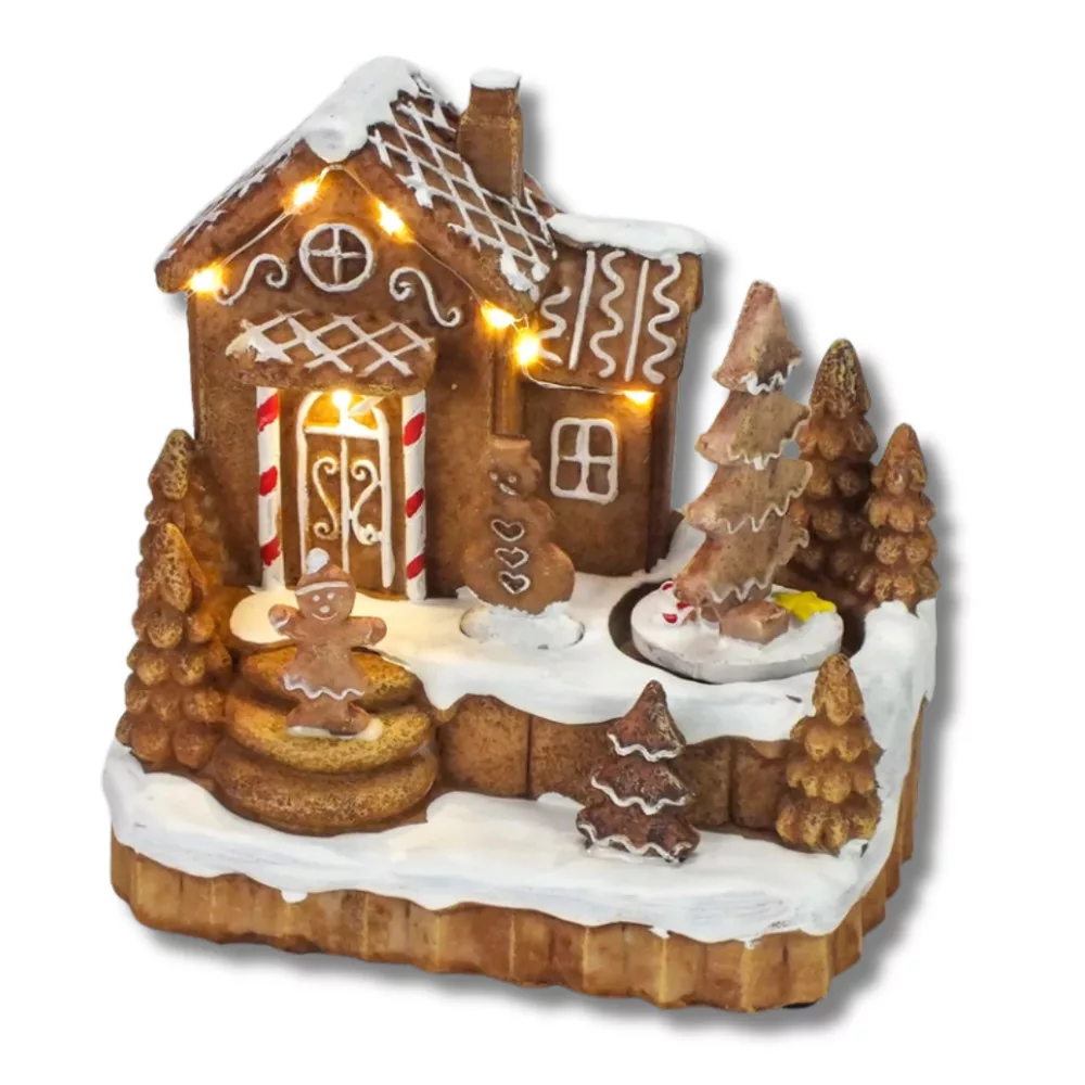 Világítós mézeskalács falu forgós fenyővel – koszorúhoz, asztaldíszhez